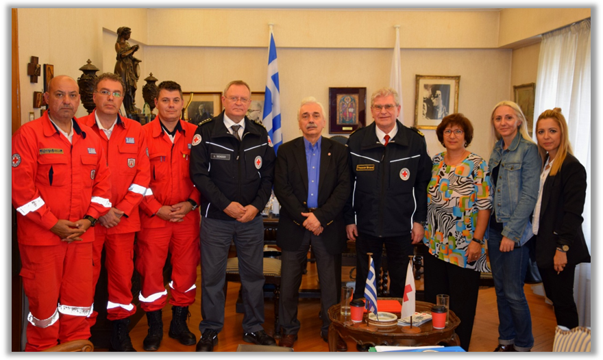 Την Τρίτη 11 Οκτωβρίου 2016, υψηλό κλιμάκιο αντιπροσωπείας του Γερμανικού Ερυθρού Σταυρού επισκέφθηκε τα Κεντρικά Γραφεία του Ε.Ε.Σ., όπου συναντήθηκε με τον Πρόεδρο του Οργανισμού Dr. Αντώνιο Αυγερινό, καθώς και με ανώτερα στελέχη του Σώματος Εθελοντών Σαμαρειτών, Διασωστών & Ναυαγοσωστών Ε.Ε.Σ., προκειμένου να συζητηθούν οι τελευταίες λεπτομέρειες της 4ης Πανελλήνιας Εκπαίδευσης Εκπαιδευτών του Σώματος (Επικαιροποίηση Γνώσεων στις Α' Βοήθειες του Ελληνικού και του Γερμανικού Ερυθρού Σταυρού). Η ποιοτικά αναβαθμισμένη αυτή εκπαίδευση ξεκινά στις Παιδικές Εξοχές του Δήμου Αθηναίων στον 'Aγιο Ανδρέα Ανατολικής Αττικής σήμερα Τέταρτη 12 Οκτωβρίου 2016 και αναμένεται να ολοκληρωθεί την Κυριακή 16 Οκτωβρίου 2016.