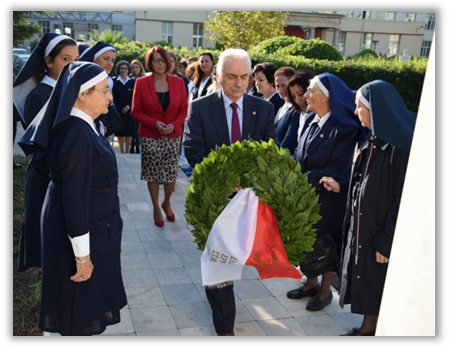 Στη σεμνή τελετή που έλαβε χώρα στο «Κοργιαλένειο - Μπενάκειο Νοσοκομείο Ε.Ε.Σ.», ο Πρόεδρος του Ελληνικού Ερυθρού Σταυρού Dr. Αντώνιος Αυγερινός κατέθεσε δάφνινο στεφάνι στο μνημείο που έχει ανεγερθεί στον προαύλιο χώρο του Νοσοκομείου, αποτίοντας φόρο τιμής στις Διπλωματούχες και Εθελόντριες Νοσηλεύτριες του Ελληνικού Ερυθρού Σταυρού, η εικόνα των οποίων είναι έντονα αποτυπωμένη στη συλλογική μνήμη του έθνους μας, στο πλευρό του Έλληνα στρατιώτη.