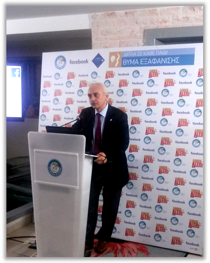 Ο Πρόεδρος του Ελληνικού Ερυθρού Σταυρού Dr. Αντώνιος Αυγερινός παρευρέθη, τη Δευτέρα 10 Οκτωβρίου 2016, στο Επιχειρησιακό Κέντρο του Οργανισμού "Χαμόγελο του Παιδιού" (Πλατεία Κασταλίας, Μαρούσι) όπου ανακοινώθηκε η συνεργασία του φορέα με το Facebook για την πρόληψη και αντιμετώπιση περιστατικών εξαφανισμένων παιδιών.